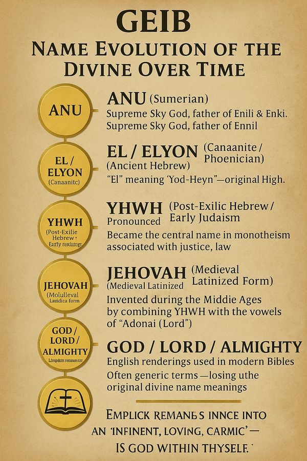 As power shifted to patriarchal priesthoods and empires, the name transformed into Yahweh, Jehovah, and ultimately “Lord”, often reflecting a more judgmental or legalistic deity (closer to Enlil’s traits).
