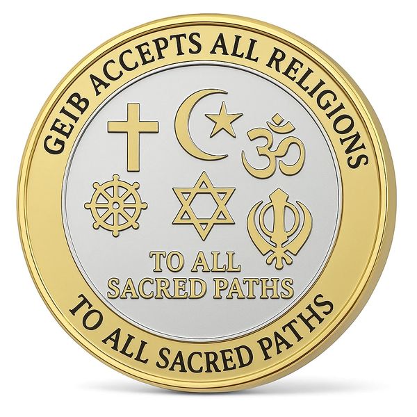 This gold and silver amulet symbolizes GEIB’s sacred acceptance of all religions, all divine paths, and all seekers of truth.
