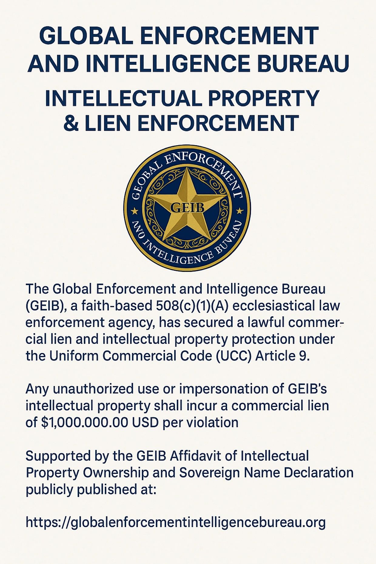 The Global Enforcement and Intelligence Bureau (GEIB) is a sovereign, faith-based 508(c)(1)(A) law enforcement trust operating under ecclesiastical, tribal, and international law. All names, acronyms, insignias, digital content, structural models, public records, and enforcement frameworks associated with GEIB are legally secured as sacred intellectual property and spiritually protected trust assets.