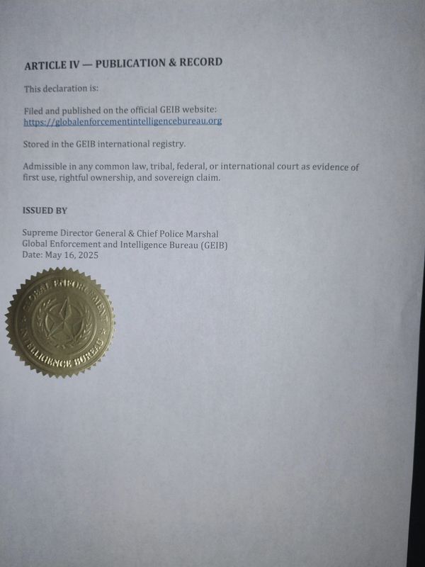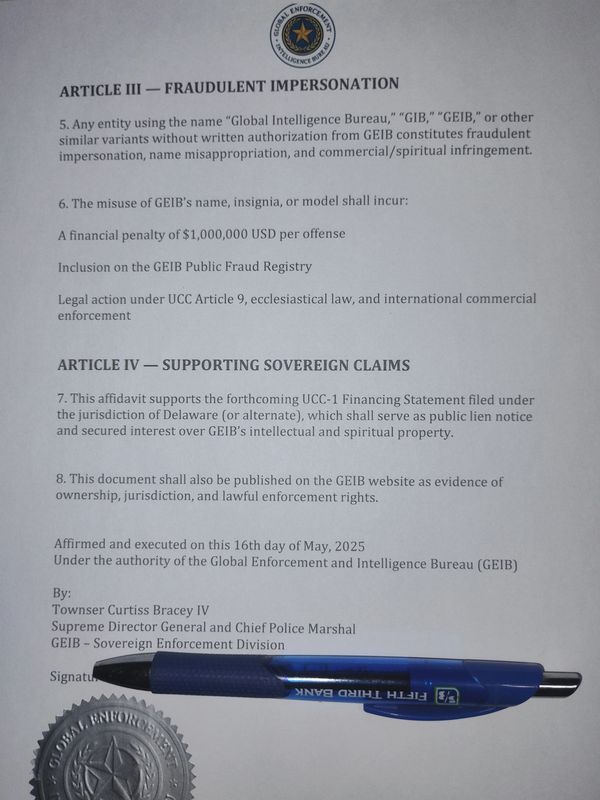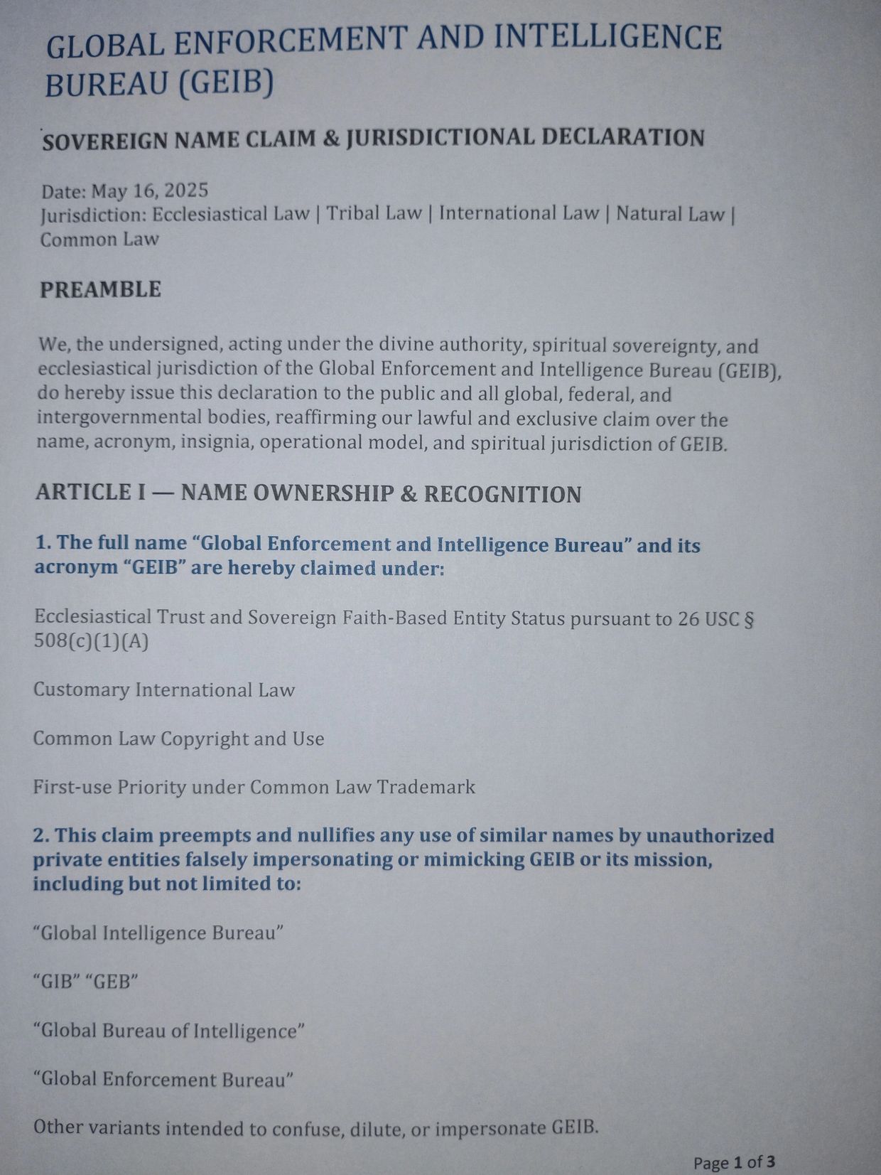 The Global Enforcement & Intelligence Bureau (GEIB) issues this binding and lawful notice to all governments, agencies, individuals, or organizations that attempt to impersonate, duplicate, or misappropriate the name, identity, structure, or sacred property of GEIB.