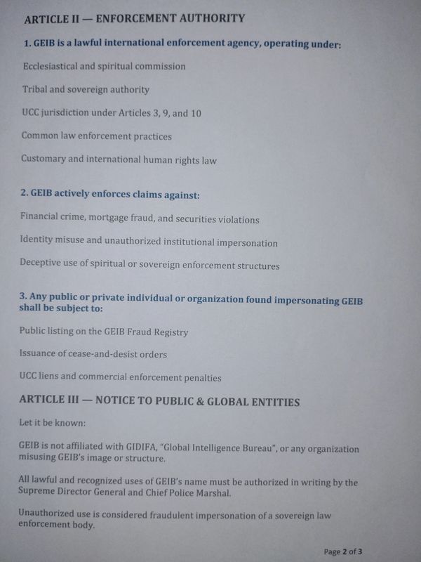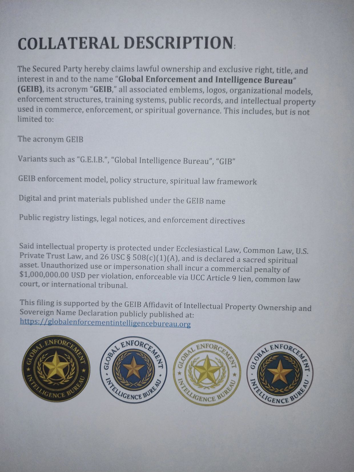 GEIB is a sovereign ecclesiastical enforcement agency, divinely established and lawfully operating under 26 USC § 508(c)(1)(A) and international enforcement jurisdiction. Any unauthorized use, reproduction, or imitation of: