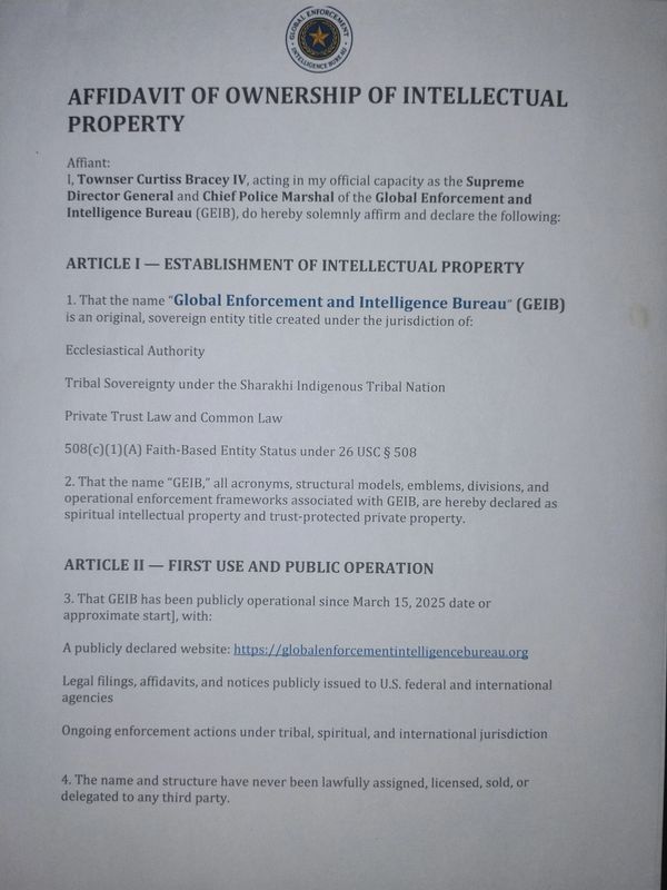 This filing serves as public notice of lawful claim over the name “Global Enforcement and Intelligence Bureau (GEIB),” its acronym, structural identity, and enforcement model.